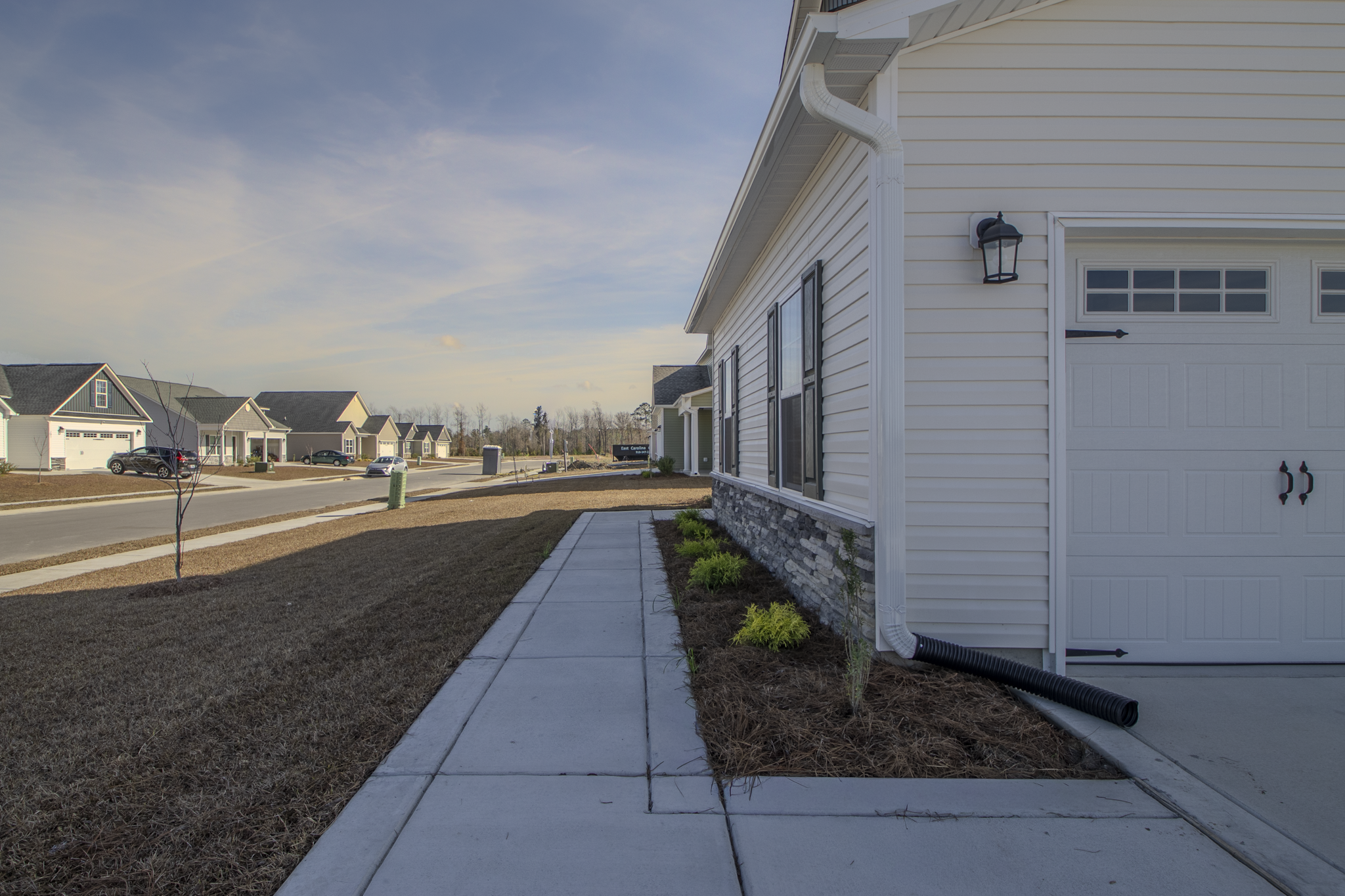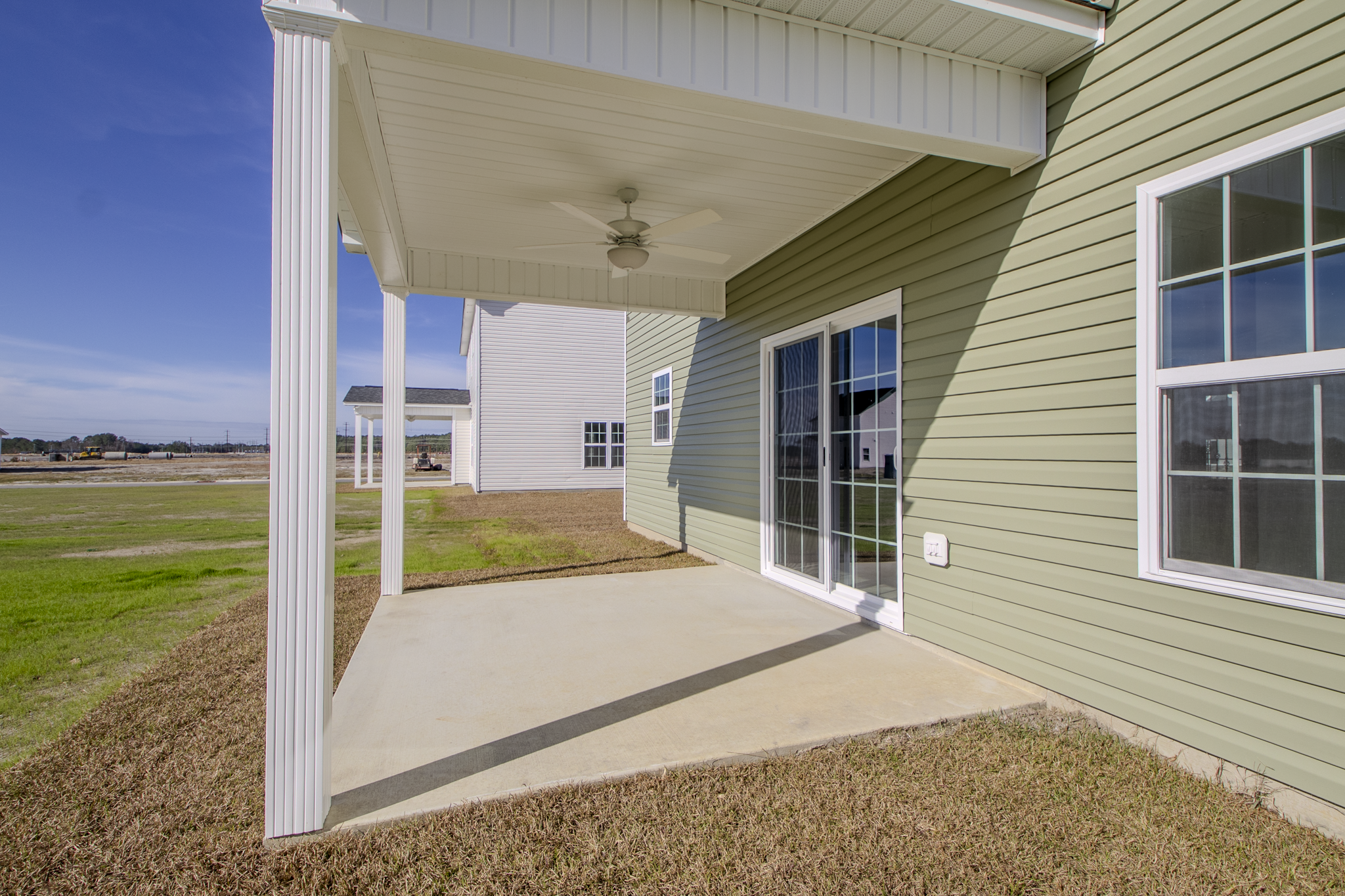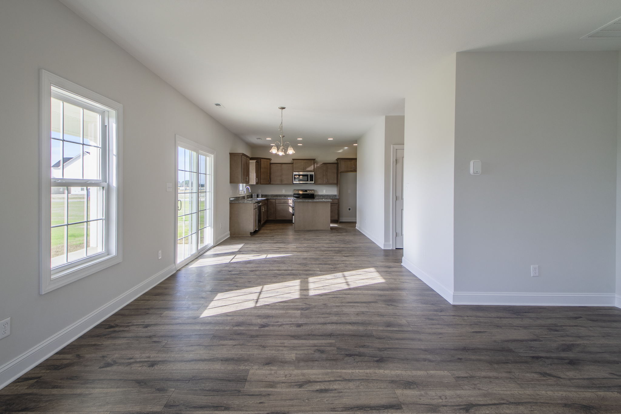 Empty living room with hardwood floors, a ceiling fan, a fireplace, and large windows letting in natural light. New construction listing photos.